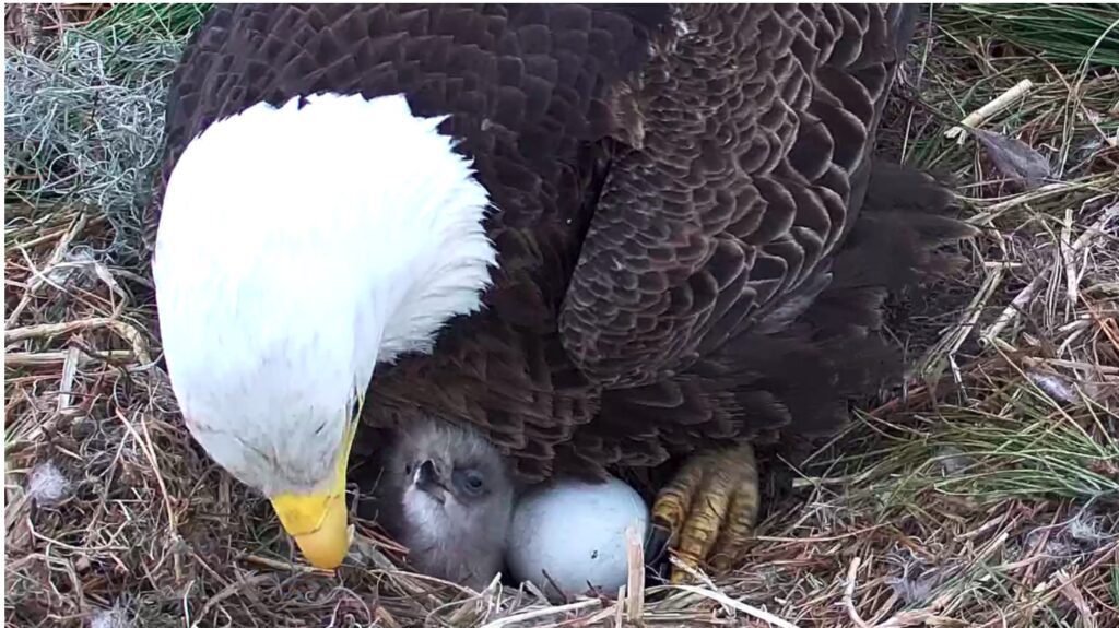 The excitement doesn’t stop there—Gracie and George’s second egg is expected to hatch soon, potentially bringing a sibling into the nest. While the eaglets will share meals, competition is inevitable, with “bonking” (a behavior where siblings peck at each other) being a natural part of their development. Nevertheless, both eaglets will grow under the watchful care of their experienced parents, offering viewers a fascinating glimpse into the life cycle of these majestic birds.