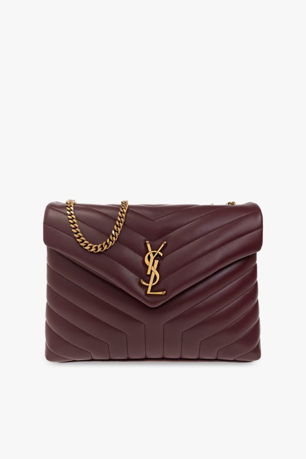 Presenting the Maroon ‘Loulou Medium’ Quilted Shoulder Bag by Saint Laurent—a divine creation crafted from supple calf leather. This luxurious piece secures effortlessly with a magnetic snap and features the iconic Saint Laurent logo beautifully adorned on the front. Its sophisticated allure is further enhanced by a chain and leather shoulder strap, complemented by lustrous gold-tone metal hardware. Inside, revel in the convenience of two separate compartments and two zip pockets, providing ample space to organize your essentials with ease. Indulge in this epitome of elegance and functionality, a true gem to elevate your style.
